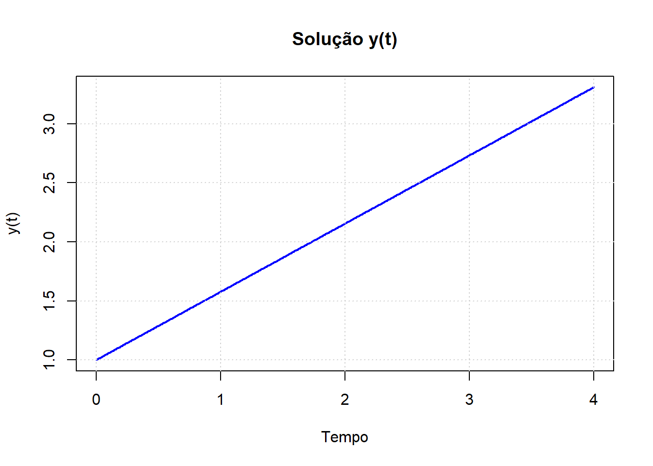 plot(out, xlab = "Tempo", col = "blue", lwd = 2, ylab = "y(t)", main = "Solução y(t)")