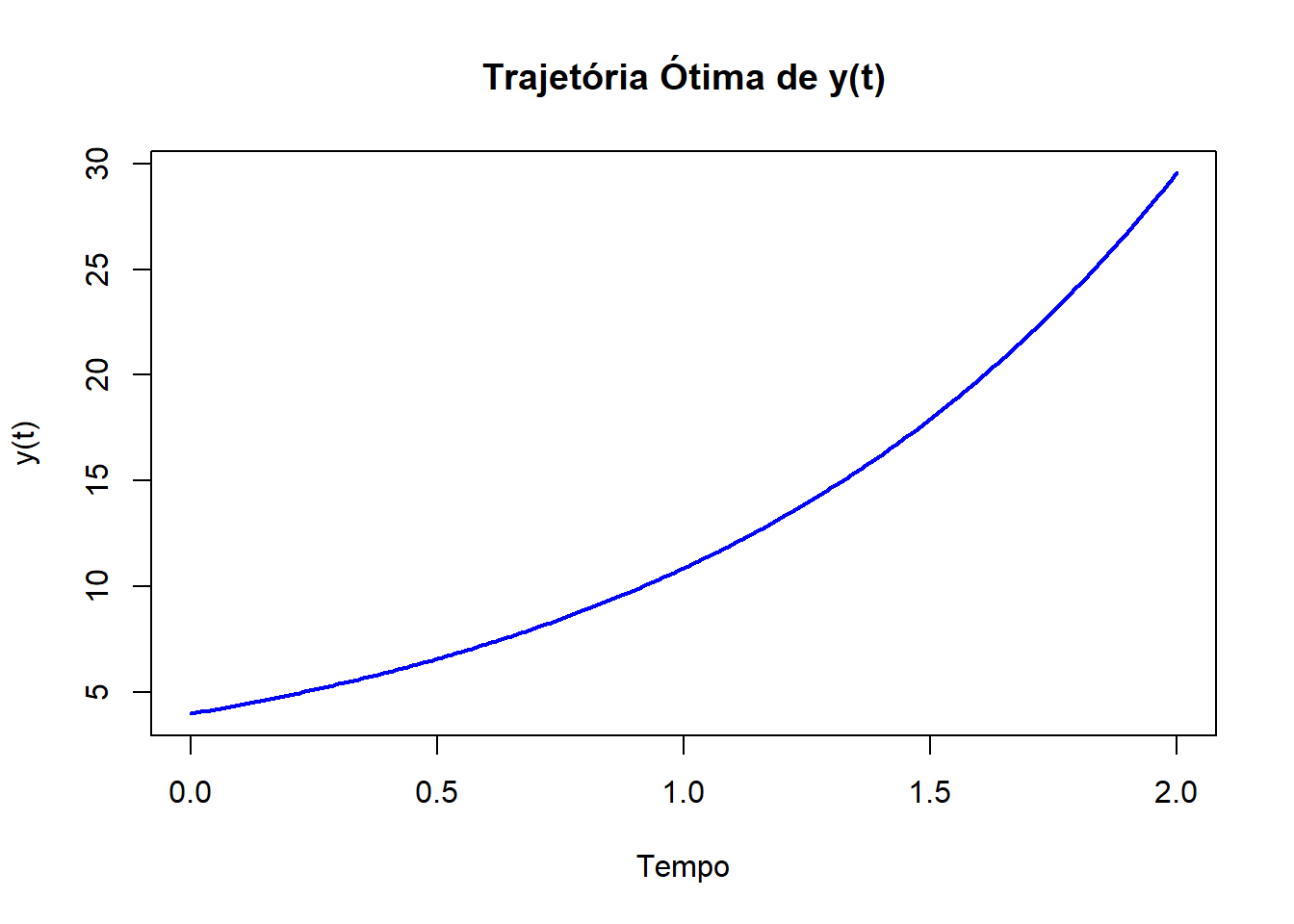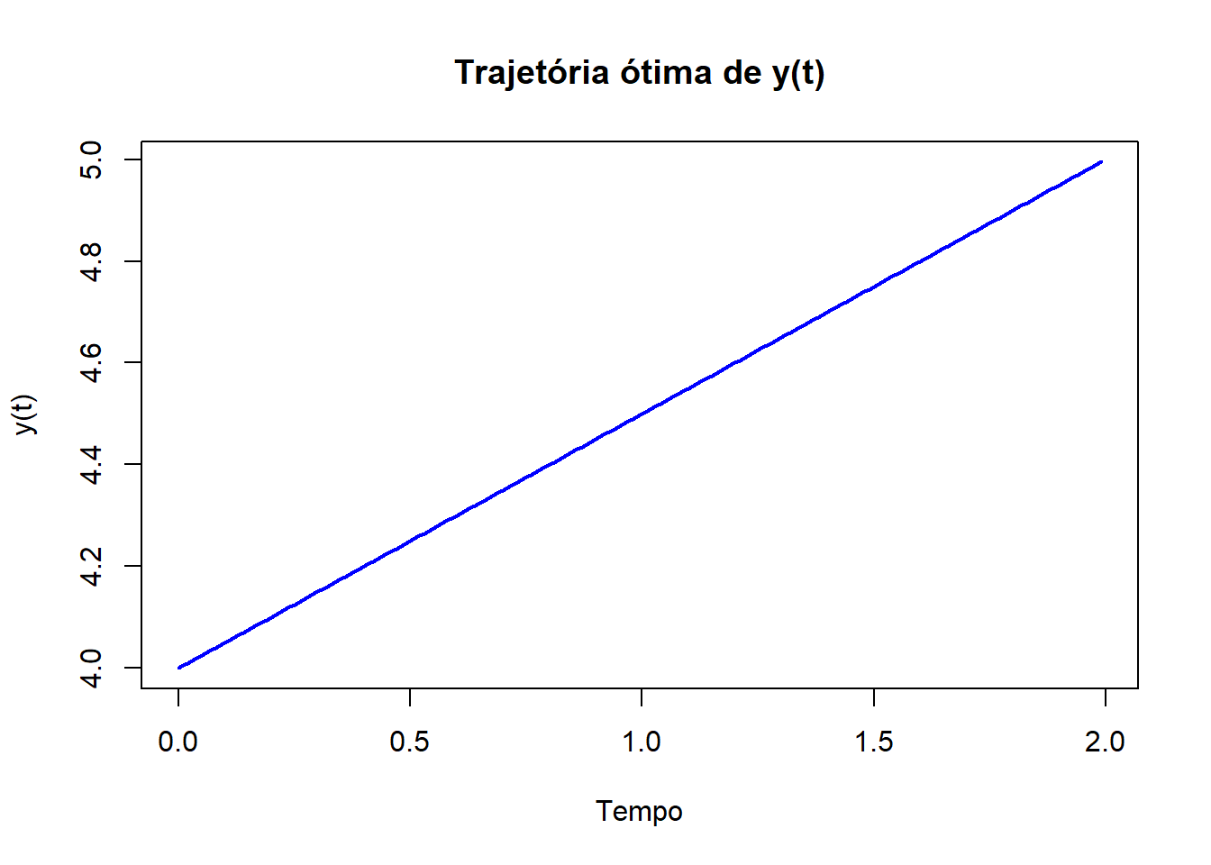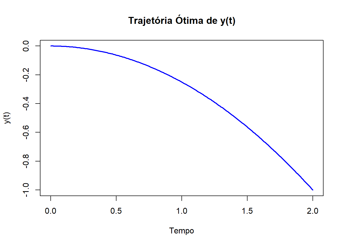 plot(results$time, results$y, type = "l", col = "blue", lwd = 2, xlab = "Tempo", ylab = "y(t)", main = "Trajetória ótima de y(t)")