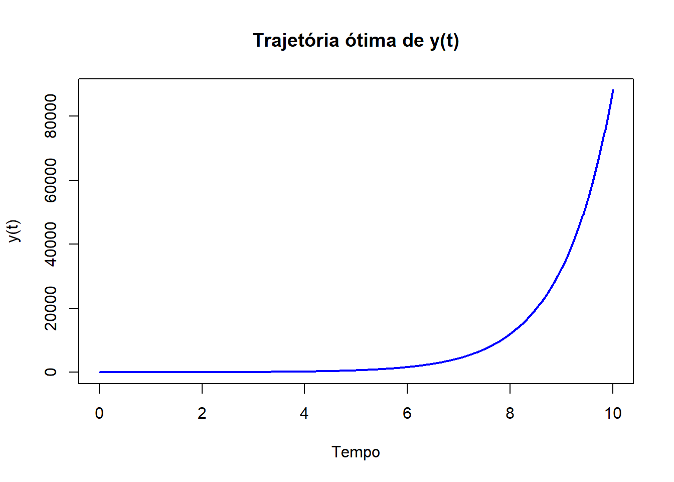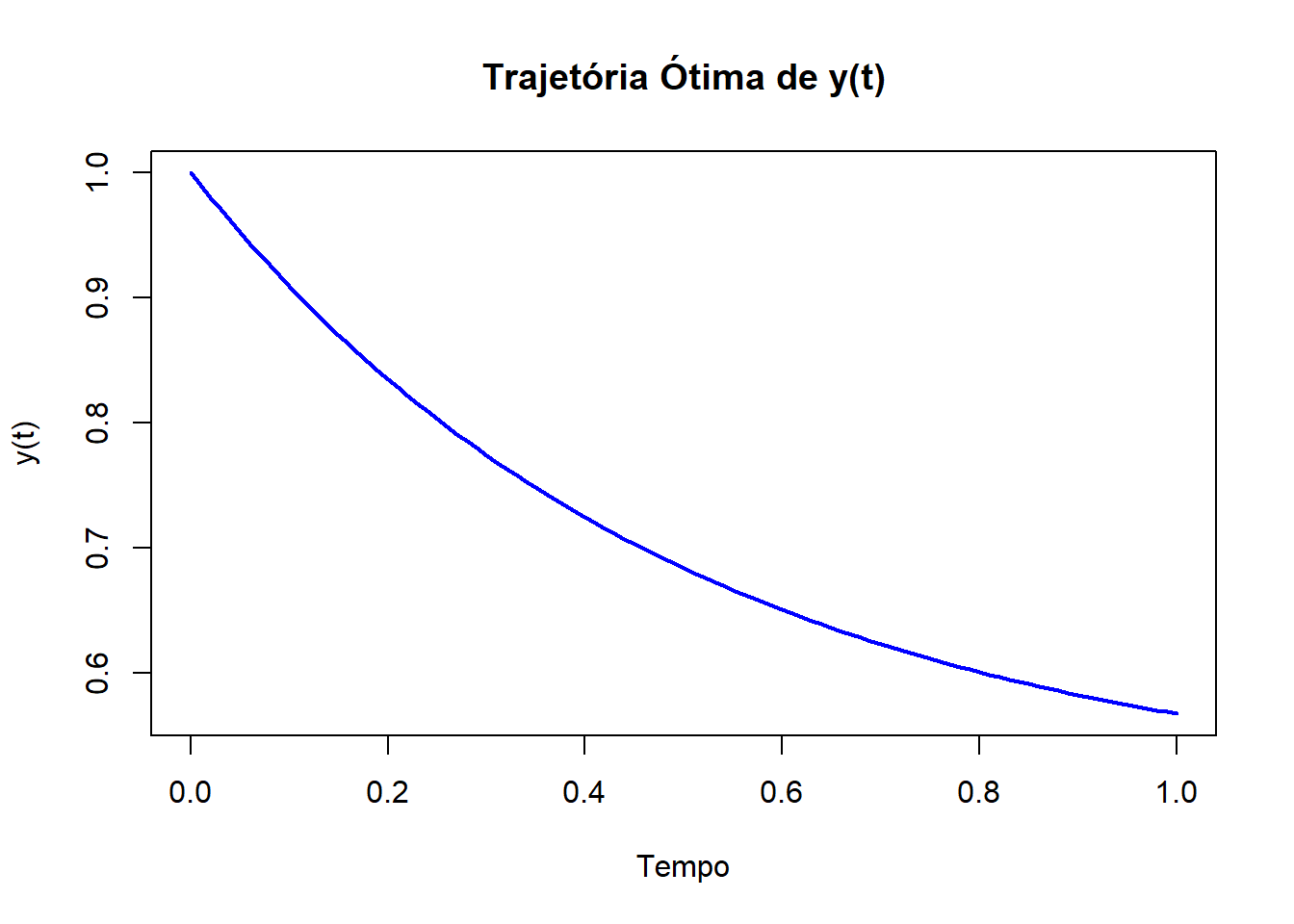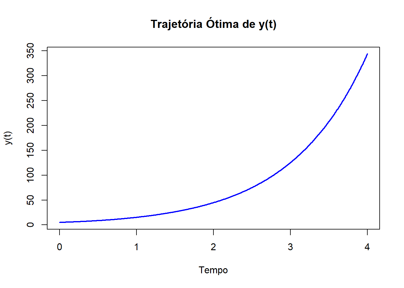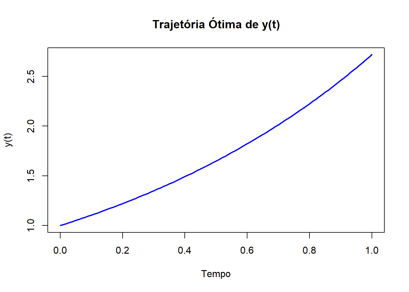 plot(results$time, results$y, type = "l", col = "blue", lwd = 2, xlab = "Tempo", ylab = "y(t)", main = "Trajetória ótima de y(t)")